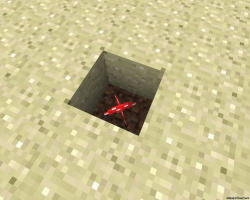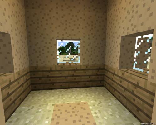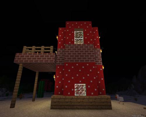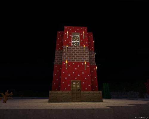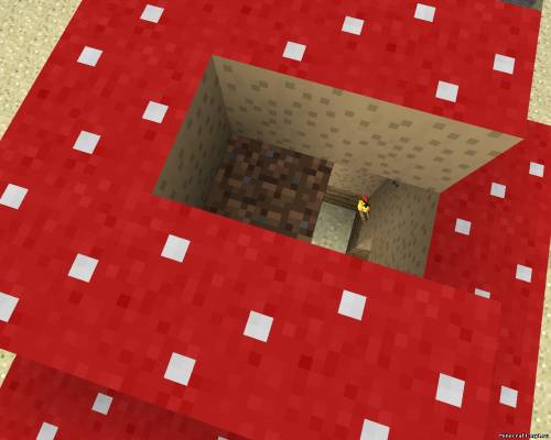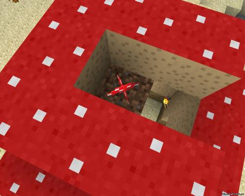 Выбравшись на крышу, сломайте 2 блока в центре и поставьте на низ землю.